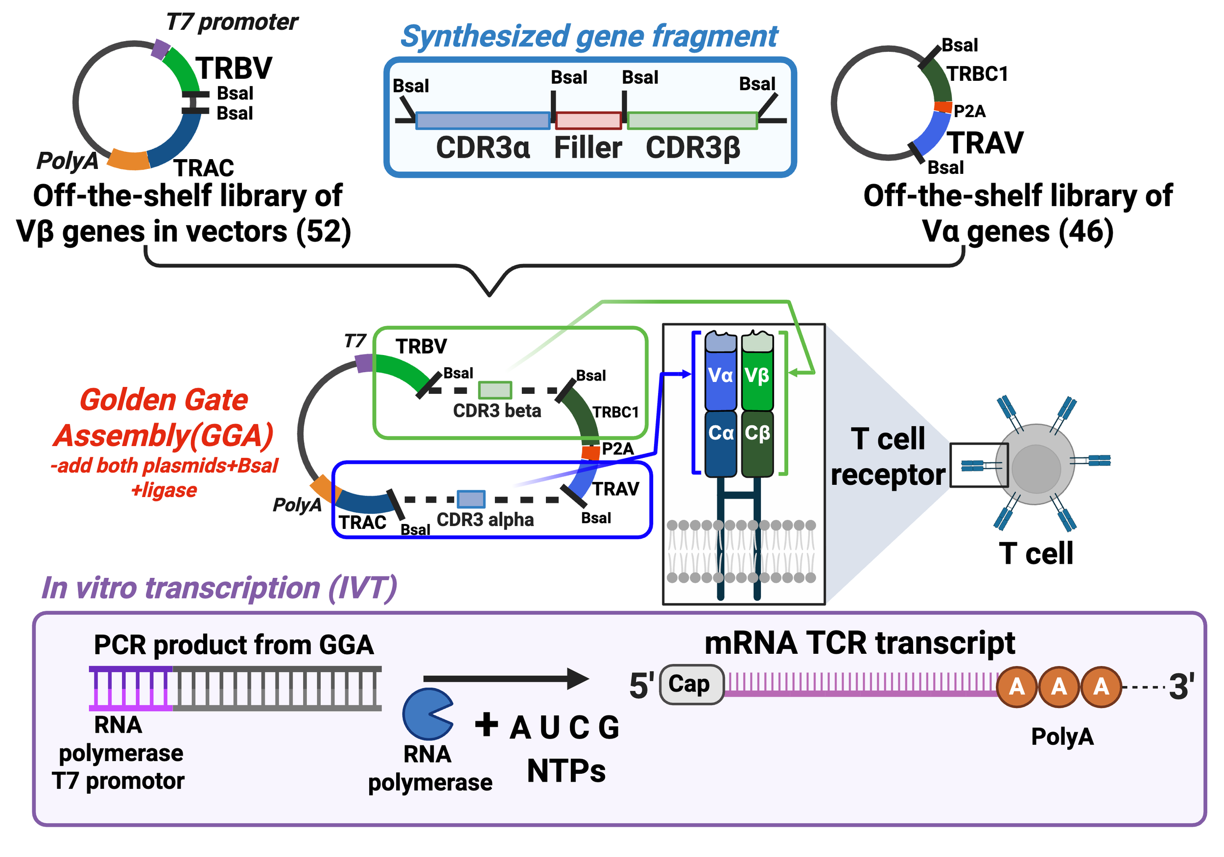 We have created a plug-and-play system to rapidly build TCRs by snapping reusable backbones together with unique synthetic inserts. This streamlined approach slashes cost and time, enabling high-throughput mRNA generation and accelerating the discovery of next-generation T cell therapies.